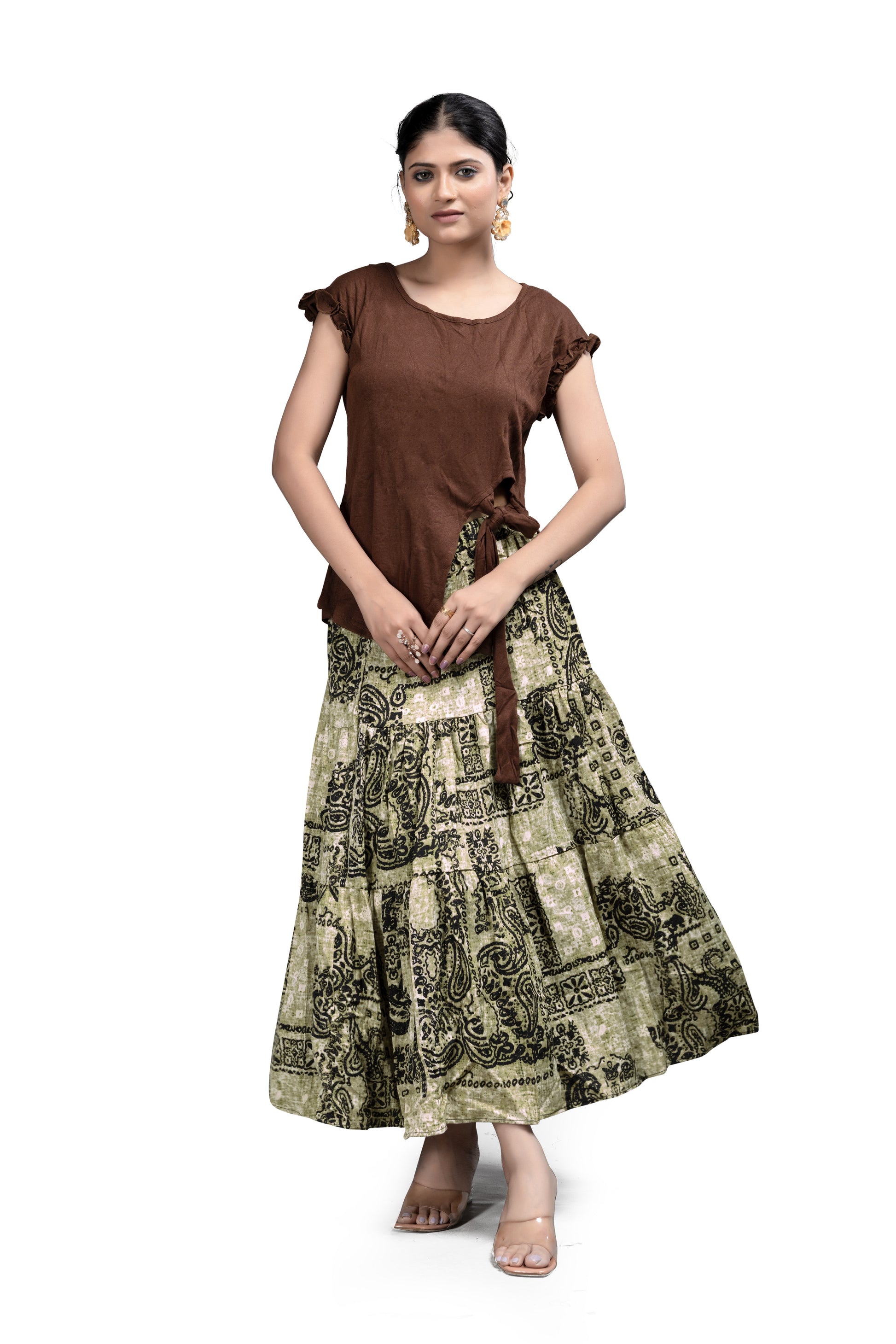 Skirt: Ankle-length with a tiered, flared design for a flowy look.
